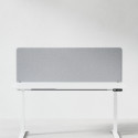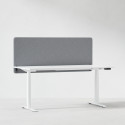 Ljudabsorberande bordsskärm med ljusgrå klädsel, fäst på skrivbordsfront. 160 centimeter bred.
