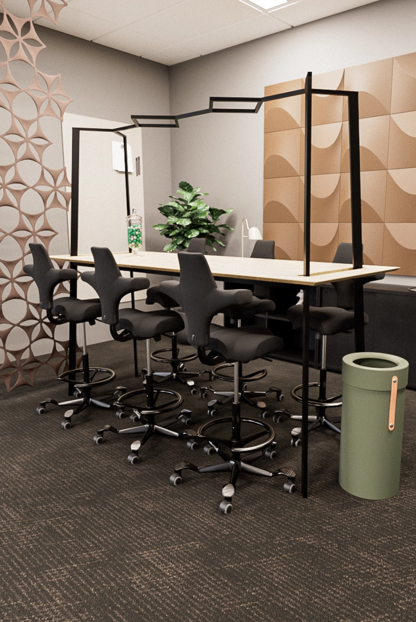 Akustik och ljudmiljöer är ett av våra många specialistområden. Vi räknar ut exakt hur många absorbenter ditt kontor behöver och hur de ska placeras i lokalen för bästa ljuddämpning. Vi tittar på flera aspekter såsom hur medarbetare rör sig genom lokalen, arbetssätt och andelen hårda ytor. Med hjälp av ljudabsorberande skärmar, gardiner, mattor och andra mjuka material sätter vi sedan ihop en inredning som passar ditt kontor perfekt.