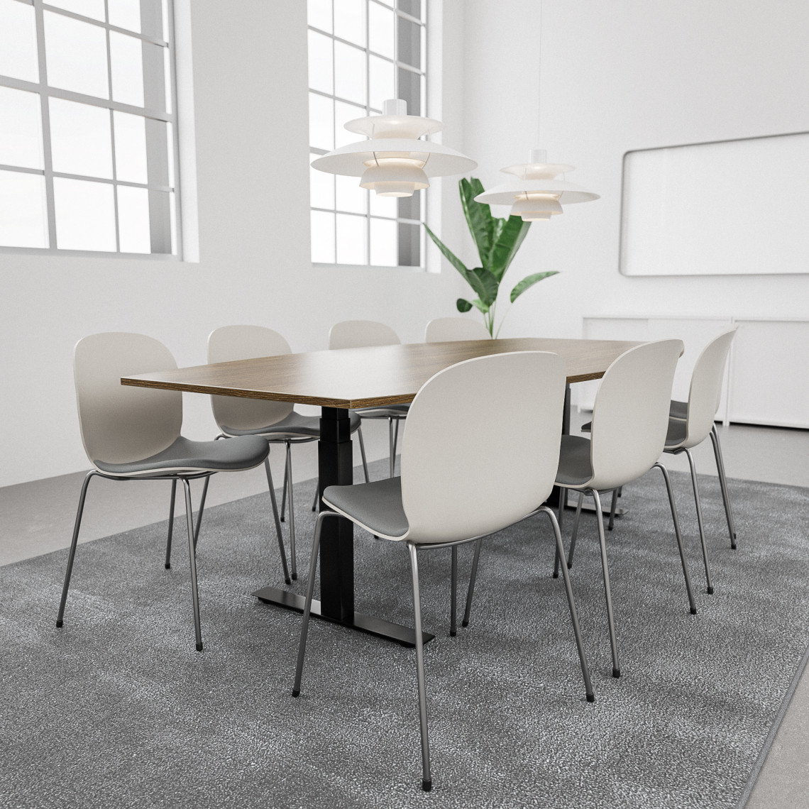 Den 2,5 centimeter tjocka bordsskivan kommer med tålig laminat som finns i flera snygga utföranden. De stabila benen i T-modell är perfekta under konferensbordet då de tar minimalt med plats och gör det lätt att få in konferensstolarna utan att benen är i vägen. Stativen är även utrustade med ställfötter som låter dig justera bordet om golvet är ojämnt.